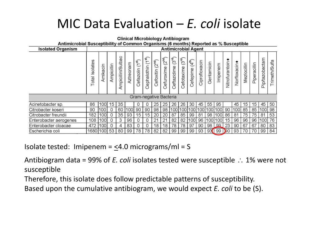 MIC Data Evaluation – E. coli isolate Isolate tested: Imipenem = <4.0 micrograms/ml = S Antibiogram data = 99% of E. coli isolates tested were susceptible 1% were not susceptible Therefore, this isolate does follow predictable patterns of susceptibility. Based upon the cumulative antibiogram, we would expect E. coli to be (S).