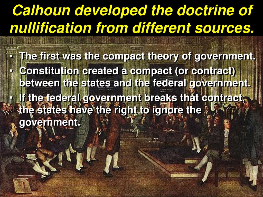 Calhoun developed the doctrine of nullification from different sources. • The first was the compact theory of government. • Constitution created a compact (or contract) between the states and the federal government. • If the federal government breaks that contract, the states have the right to ignore the government.
