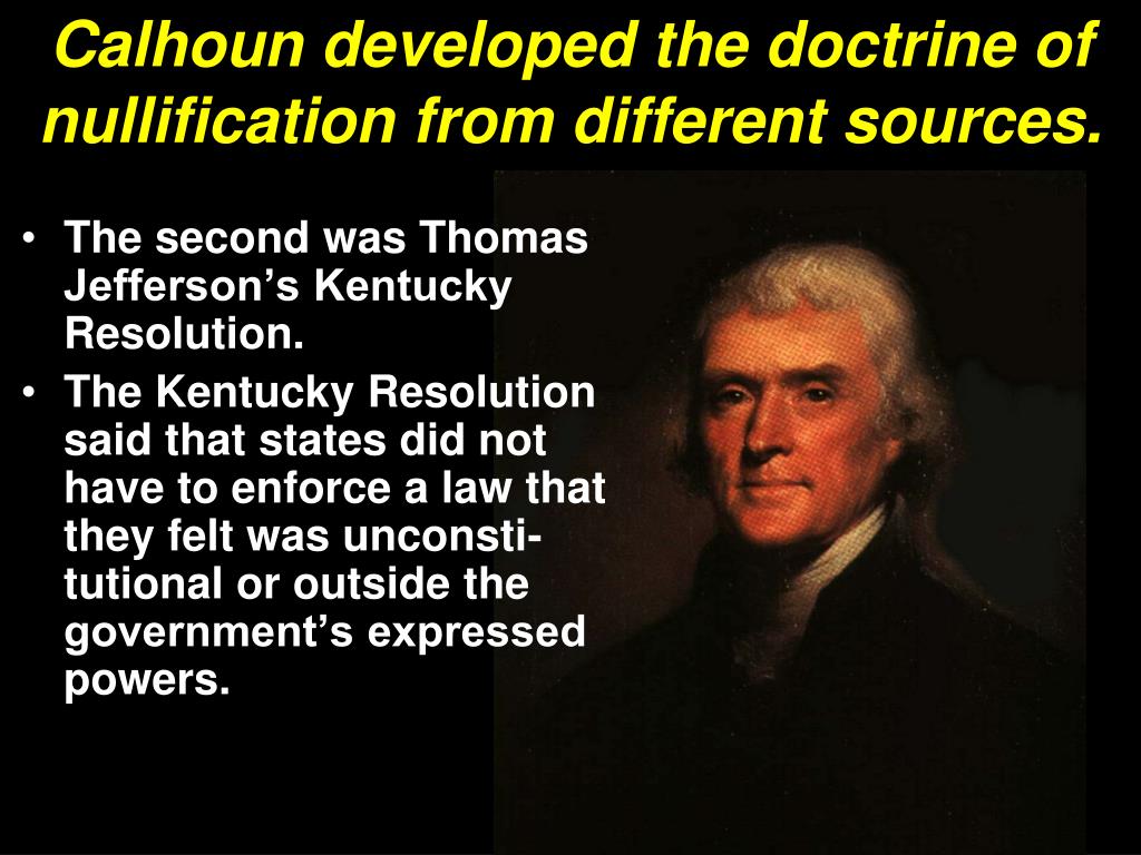 Calhoun developed the doctrine of nullification from different sources. • The second was Thomas Jefferson’s Kentucky Resolution. • The Kentucky Resolution said that states did not have to enforce a law that they felt was unconsti-tutional or outside the government’s expressed powers.