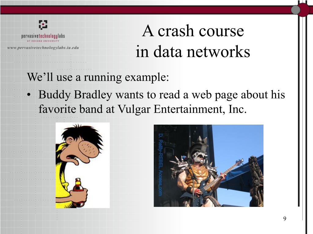 A crash coursein data networks We’ll use a running example: • Buddy Bradley wants to read a web page about his favorite band at Vulgar Entertainment, Inc.