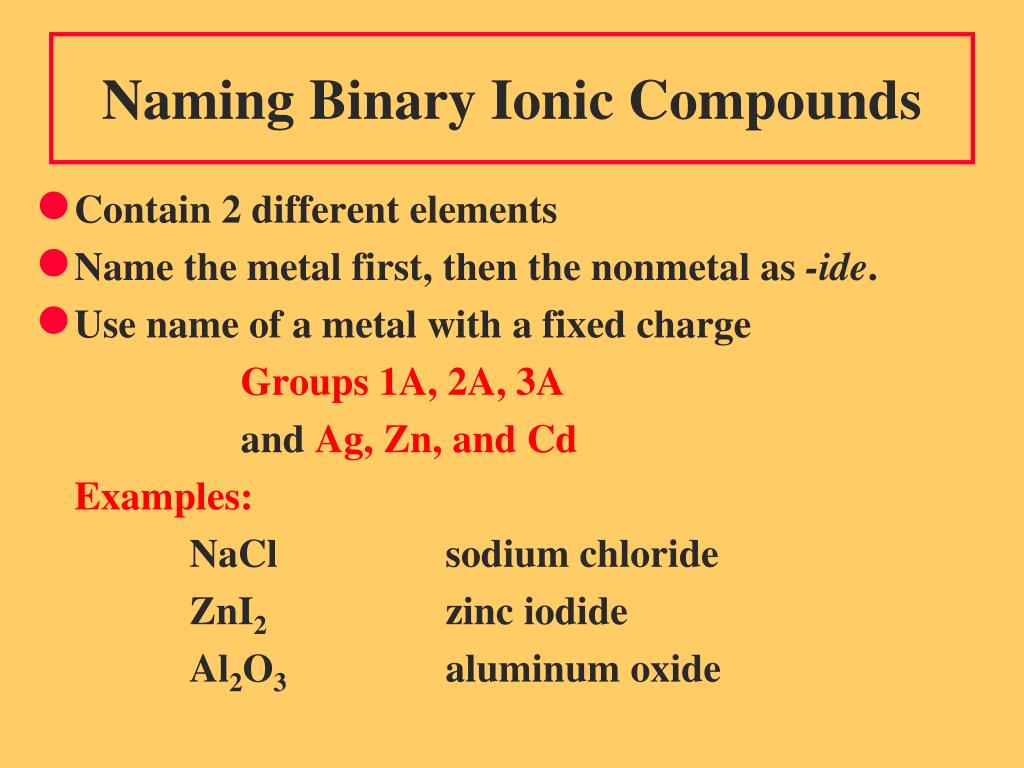 Naming Binary Ionic Compounds • Contain 2 different elements • Name the metal first, then the nonmetal as -ide. • Use name of a metal with a fixed charge Groups 1A, 2A, 3A and Ag, Zn, and Cd Examples: NaCl sodium chloride ZnI2 zinc iodide Al2O3 aluminum oxide
