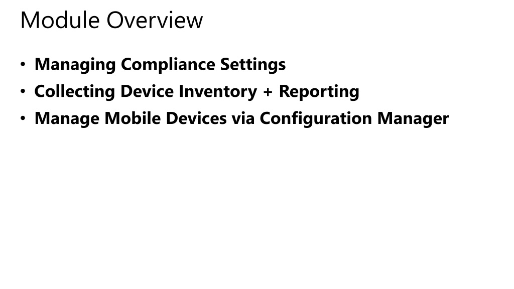 Module Overview • Managing Compliance Settings • Collecting Device Inventory + Reporting • Manage Mobile Devices via Configuration Manager