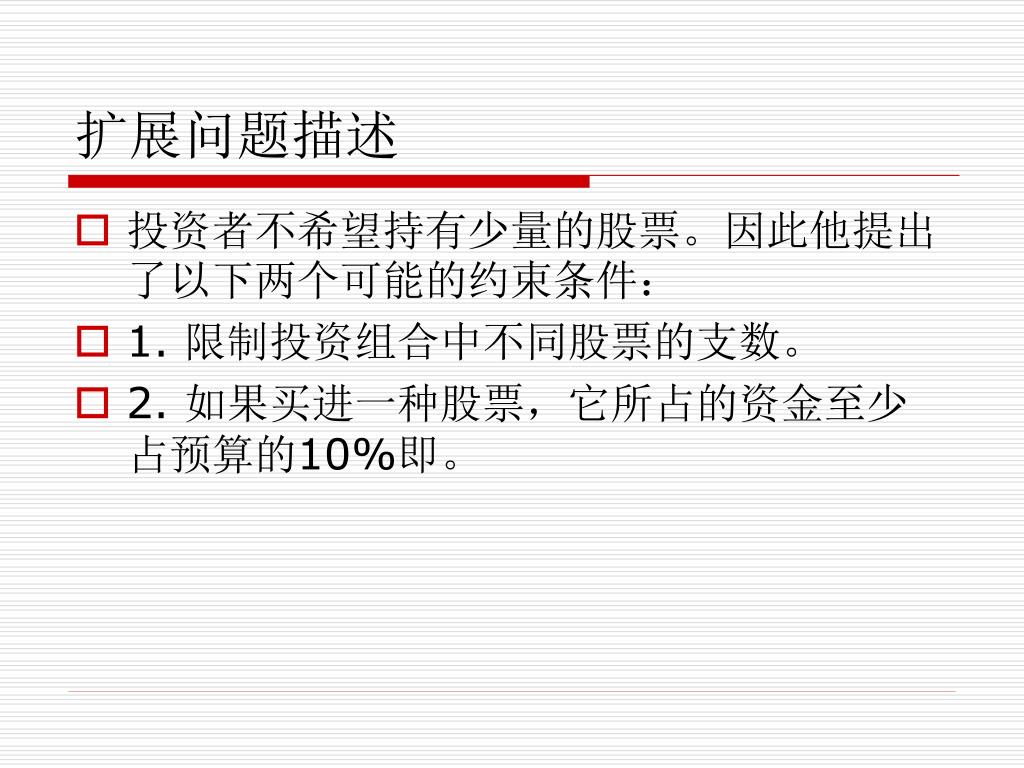 扩展问题描述 • 投资者不希望持有少量的股票。因此他提出了以下两个可能的约束条件: • 1. 限制投资组合中不同股票的支数。 • 2. 如果买进一种股票,它所占的资金至少占预算的10%即。