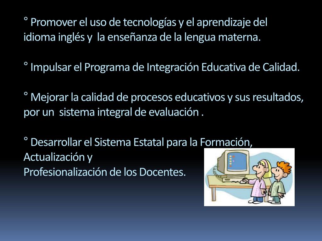 ° Promover el uso de tecnologías y el aprendizaje delidioma inglés y la enseñanza de la lengua materna.° Impulsar el Programa de Integración Educativa de Calidad.° Mejorar la calidad de procesos educativos y sus resultados, por un sistema integral de evaluación .° Desarrollar el Sistema Estatal para la Formación, Actualización yProfesionalización de los Docentes.