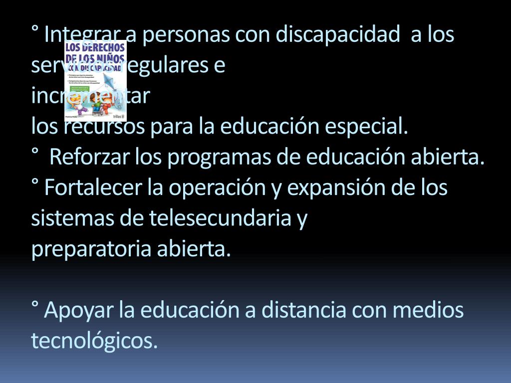 ° Integrar a personas con discapacidad a los servicios regulares e incrementarlos recursos para la educación especial.° Reforzar los programas de educación abierta.° Fortalecer la operación y expansión de los sistemas de telesecundaria ypreparatoria abierta.° Apoyar la educación a distancia con medios tecnológicos.