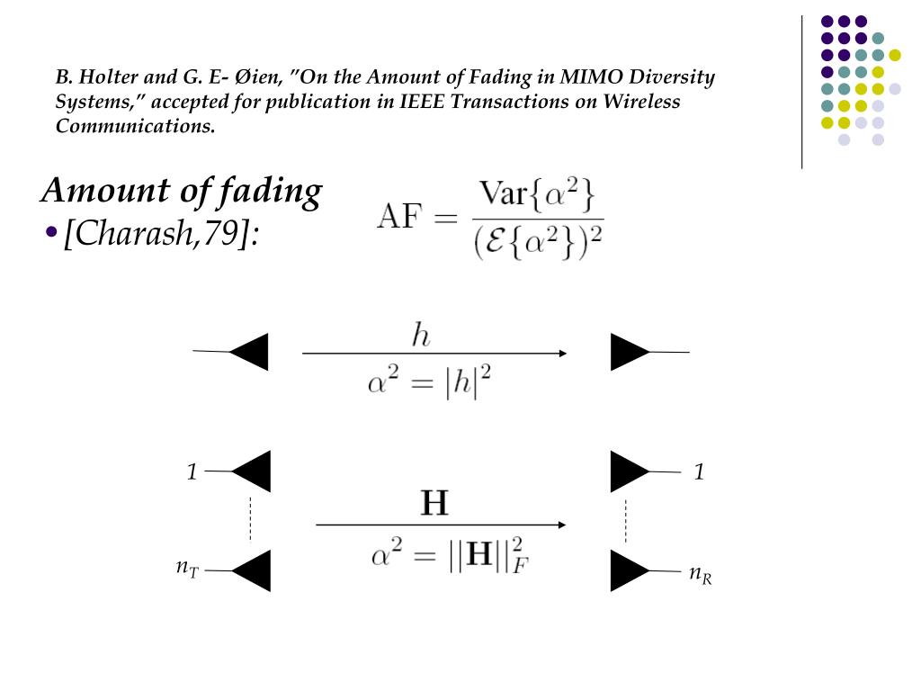 1 1 nT nR B. Holter and G. E- Øien, ”On the Amount of Fading in MIMO Diversity Systems,” accepted for publication in IEEE Transactions on Wireless Communications. • Amount of fading • [Charash,79]: