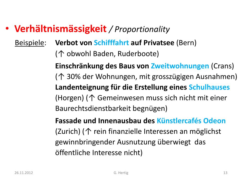 Verhältnismässigkeit/ Proportionality Beispiele: Verbot von Schifffahrtauf Privatsee (Bern) (↑ obwohl Baden, Ruderboote) Einschränkung des Baus von Zweitwohnungen (Crans)(↑ 30% der Wohnungen, mit grosszügigen Ausnahmen)Landenteignung für die Erstellung eines Schulhauses (Horgen) (↑ Gemeinwesen muss sich nicht mit einer Baurechtsdienstbarkeit begnügen) Fassade und Innenausbau des Künstlercafés Odeon (Zurich) (↑ rein finanzielle Interessen an möglichst gewinnbringender Ausnutzung überwiegt das öffentliche Interesse nicht) G. Hertig