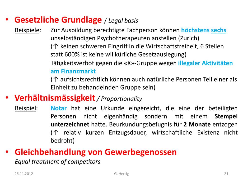 Gesetzliche Grundlage / Legal basis Beispiele: ZurAusbildung berechtigte Fachperson können höchstens sechsunselbständigen Psychotherapeuten anstellen (Zurich) (↑ keinen schweren Eingriff in die Wirtschaftsfreiheit, 6 Stellen statt 600% ist keine willkürliche Gesetzauslegung) Tätigkeitsverbot gegen die «X»-Gruppe wegen illegaler Aktivitäten am Finanzmarkt (↑ aufsichtsrechtlich können auch natürliche Personen Teil einer als Einheit zu behandelnden Gruppe sein) • Verhältnismässigkeit/ Proportionality Beispiel: Notar hat eine Urkunde eingereicht, die eine der beteiligten Personen nicht eigenhändig sondern mit einem Stempel unterzeichnet hatte. Beurkundungsbefugnis für 2 Monate entzogen(↑relativ kurzen Entzugsdauer, wirtschaftliche Existenz nicht bedroht) • Gleichbehandlung von GewerbegenossenEqual treatment of competitors G. Hertig