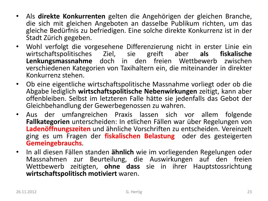 Als direkte Konkurrenten gelten die Angehörigen der gleichen Branche, die sich mit gleichen Angeboten an dasselbe Publikum richten, um das gleiche Bedürfnis zu befriedigen. Eine solche direkte Konkurrenz ist in der Stadt Zürich gegeben. • Wohl verfolgt die vorgesehene Differenzierung nicht in erster Linie ein wirtschaftspolitisches Ziel, sie greift aber als fiskalische Lenkungsmassnahme doch in den freien Wettbewerb zwischen verschiedenen Kategorien von Taxihaltern ein, die miteinander in direkter Konkurrenz stehen. • Ob eine eigentliche wirtschaftspolitische Massnahme vorliegt oder ob die Abgabe lediglich wirtschaftspolitische Nebenwirkungen zeitigt, kann aber offenbleiben. Selbst im letzteren Falle hätte sie jedenfalls das Gebot der Gleichbehandlung der Gewerbegenossen zu wahren. • Aus der umfangreichen Praxis lassen sich vor allem folgende Fallkategorien unterscheiden: In etlichen Fällen war über Regelungen von Ladenöffnungszeiten und ähnliche Vorschriften zu entscheiden. Vereinzelt ging es um Fragen der fiskalischen Belastung oder des gesteigerten Gemeingebrauchs. • In all diesen Fällen standen ähnlich wie im vorliegenden Regelungen oder Massnahmen zur Beurteilung, die Auswirkungen auf den freien Wettbewerb zeitigten, ohne dass sie in ihrer Hauptstossrichtung wirtschaftspolitisch motiviert waren. G. Hertig