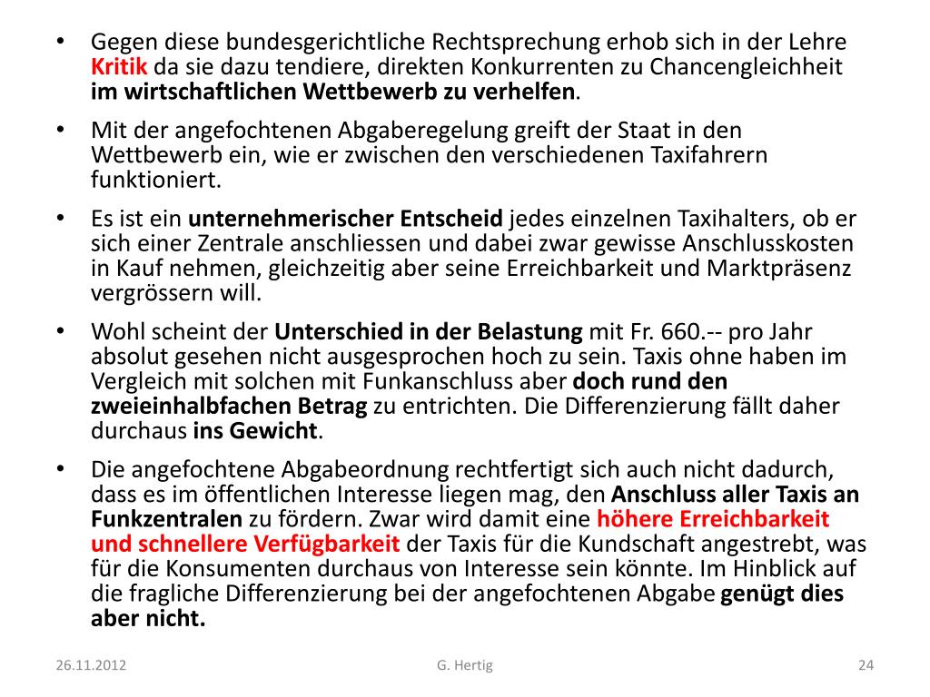 Gegen diese bundesgerichtliche Rechtsprechung erhob sich in der Lehre Kritik da sie dazu tendiere, direkten Konkurrenten zu Chancengleichheit im wirtschaftlichen Wettbewerb zu verhelfen. • Mit der angefochtenen Abgaberegelung greift der Staat in den Wettbewerb ein, wie er zwischen den verschiedenen Taxifahrern funktioniert. • Es ist ein unternehmerischer Entscheid jedes einzelnen Taxihalters, ob er sich einer Zentrale anschliessen und dabei zwar gewisse Anschlusskosten in Kauf nehmen, gleichzeitig aber seine Erreichbarkeit und Marktpräsenz vergrössern will. • Wohl scheint der Unterschied in der Belastung mit Fr. 660.-- pro Jahr absolut gesehen nicht ausgesprochen hoch zu sein. Taxis ohne haben im Vergleich mit solchen mit Funkanschluss aber doch rund den zweieinhalbfachen Betrag zu entrichten. Die Differenzierung fällt daher durchaus ins Gewicht. • Die angefochtene Abgabeordnung rechtfertigt sich auch nicht dadurch, dass es im öffentlichen Interesse liegen mag, den Anschluss aller Taxis an Funkzentralen zu fördern. Zwar wird damit eine höhere Erreichbarkeit und schnellere Verfügbarkeit der Taxis für die Kundschaft angestrebt, was für die Konsumenten durchaus von Interesse sein könnte. Im Hinblick auf die fragliche Differenzierung bei der angefochtenen Abgabe genügt dies aber nicht. G. Hertig