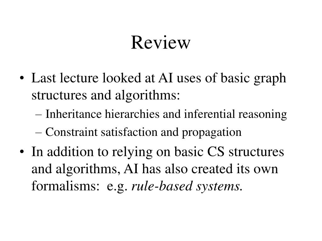 Review • Last lecture looked at AI uses of basic graph structures and algorithms: • Inheritance hierarchies and inferential reasoning • Constraint satisfaction and propagation • In addition to relying on basic CS structures and algorithms, AI has also created its own formalisms: e.g. rule-based systems.