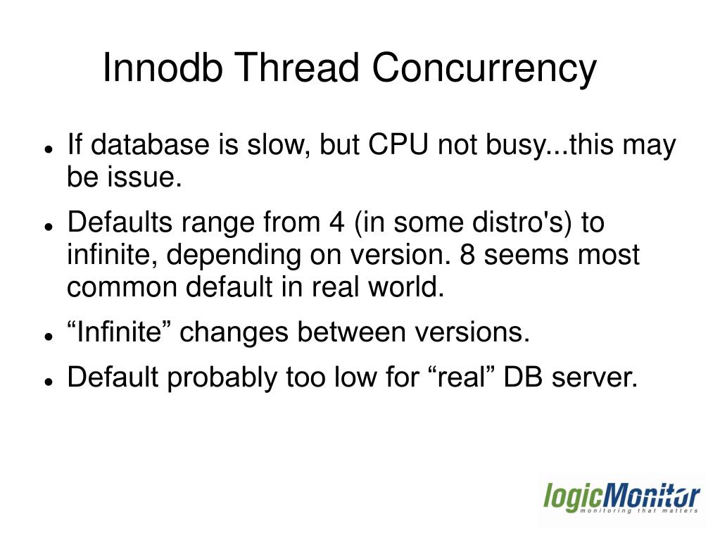 Innodb Thread Concurrency • If database is slow, but CPU not busy...this may be issue. • Defaults range from 4 (in some distro's) to infinite, depending on version. 8 seems most common default in real world. • “Infinite” changes between versions. • Default probably too low for “real” DB server.