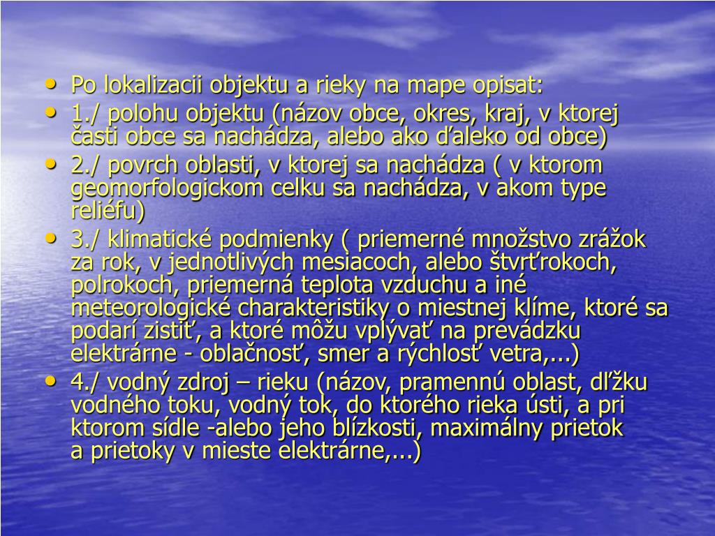 Po lokalizacii objektu a rieky na mape opisat: • 1./ polohu objektu (názov obce, okres, kraj, v ktorej časti obce sa nachádza, alebo ako ďaleko od obce) • 2./ povrch oblasti, v ktorej sa nachádza ( v ktorom geomorfologickom celku sa nachádza, v akom type reliéfu) • 3./ klimatické podmienky ( priemerné množstvo zrážok za rok, v jednotlivých mesiacoch, alebo štvrťrokoch, polrokoch, priemerná teplota vzduchu a iné meteorologické charakteristiky o miestnej klíme, ktoré sa podarí zistiť, a ktoré môžu vplývať na prevádzku elektrárne - oblačnosť, smer a rýchlosť vetra,...) • 4./ vodný zdroj – rieku (názov, pramennú oblast, dľžku vodného toku, vodný tok, do ktorého rieka ústi, a pri ktorom sídle -alebo jeho blízkosti, maximálny prietok a prietoky v mieste elektrárne,...)