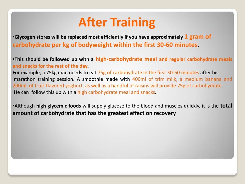 After Training • Glycogen stores will be replaced most efficiently if you have approximately 1 gram of carbohydrate per kg of bodyweight within the first 30-60 minutes. • This should be followed up with ahigh-carbohydrate meal and regular carbohydrate meals and snacks for the rest of the day. For example, a 75kg man needs to eat 75g of carbohydrate in the first 30-60 minutes after his marathon training session.A smoothie made with 400ml of trim milk, a medium banana and 200ml of fruit-flavored yoghurt,as well as a handful of raisins will provide 75g of carbohydrate. He can follow this up with a high carbohydrate meal and snacks. • Although high glycemicfoods will supply glucose to the blood and muscles quickly, it is the total amount of carbohydrate that has the greatest effect on recovery