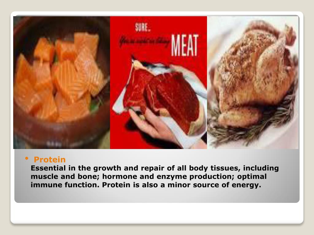 Protein • Essential in the growth and repair of all body tissues, including • muscle and bone; hormone and enzyme production; optimal • immune function. Protein is also a minor source of energy.