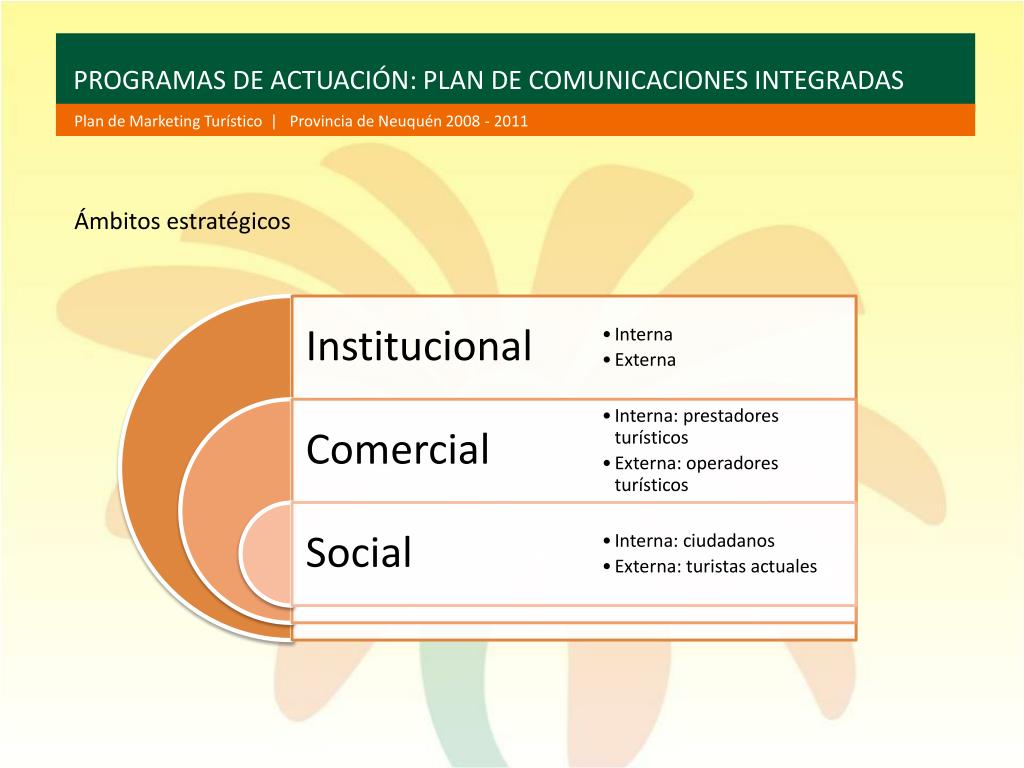 PROGRAMAS DE ACTUACIÓN: PLAN DE COMUNICACIONES INTEGRADAS Plan de Marketing Turístico | Provincia de Neuquén 2008 - 2011 Ámbitos estratégicos