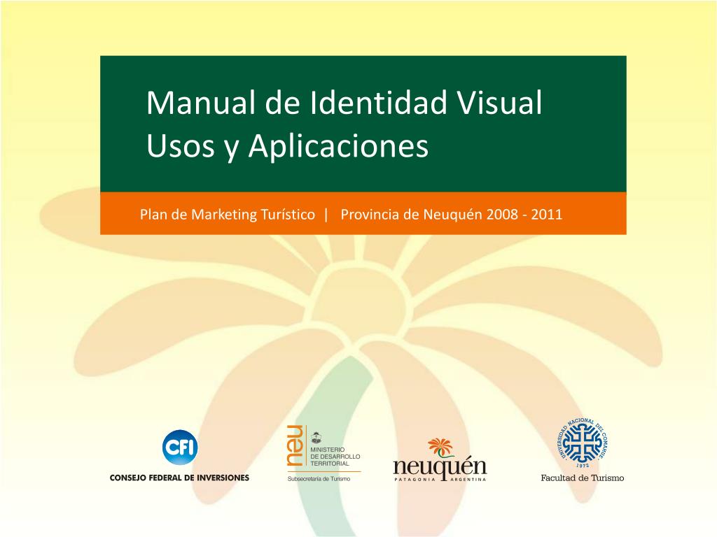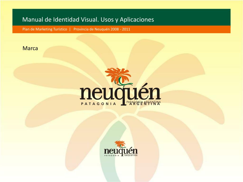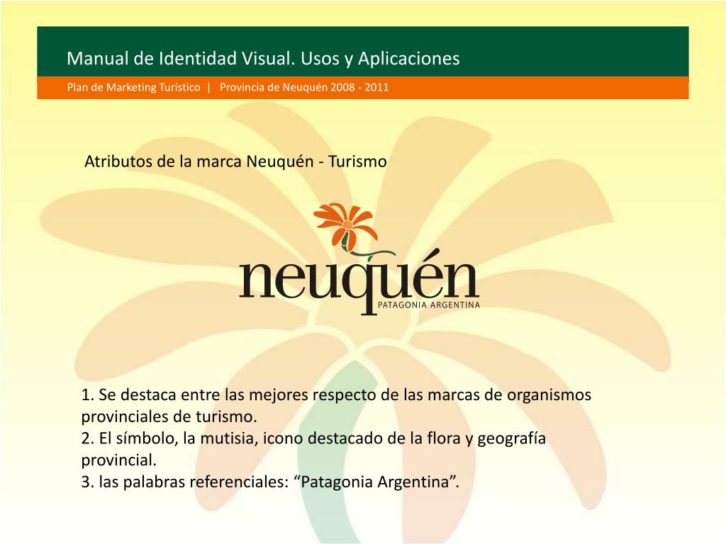 Manual de Identidad Visual. Usos y Aplicaciones Plan de Marketing Turístico | Provincia de Neuquén 2008 - 2011 Atributos de la marca Neuquén - Turismo 1. Se destaca entre las mejores respecto de las marcas de organismos provinciales de turismo. 2. El símbolo, la mutisia, icono destacado de la flora y geografía provincial. 3. las palabras referenciales: “Patagonia Argentina”.