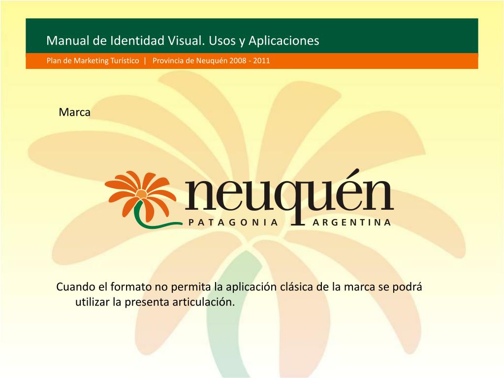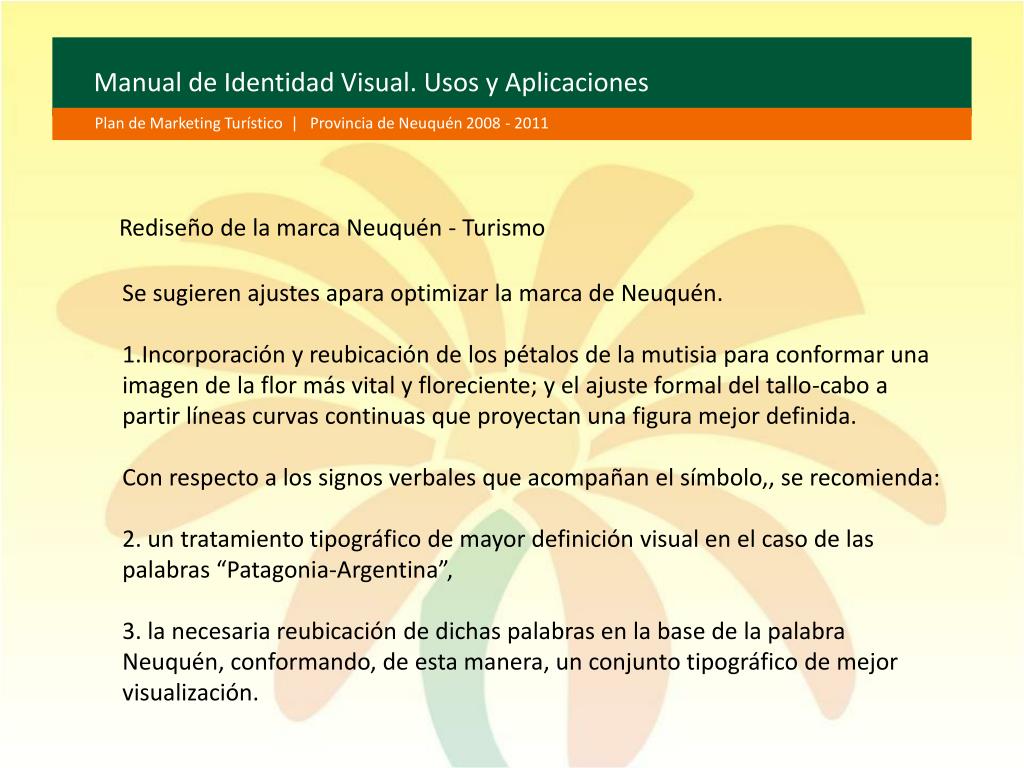 Manual de Identidad Visual. Usos y Aplicaciones Plan de Marketing Turístico | Provincia de Neuquén 2008 - 2011 Rediseño de la marca Neuquén - Turismo Se sugieren ajustes apara optimizar la marca de Neuquén. 1.Incorporación y reubicación de los pétalos de la mutisia para conformar una imagen de la flor más vital y floreciente; y el ajuste formal del tallo-cabo a partir líneas curvas continuas que proyectan una figura mejor definida. Con respecto a los signos verbales que acompañan el símbolo,, se recomienda: 2. un tratamiento tipográfico de mayor definición visual en el caso de las palabras “Patagonia-Argentina”, 3. la necesaria reubicación de dichas palabras en la base de la palabra Neuquén, conformando, de esta manera, un conjunto tipográfico de mejor visualización.