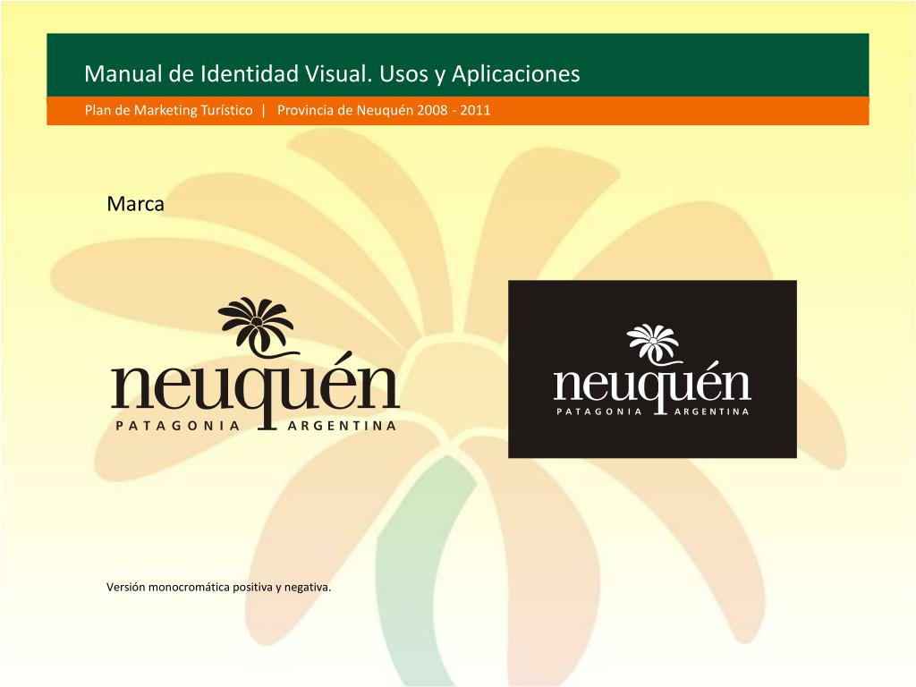 Manual de Identidad Visual. Usos y Aplicaciones Plan de Marketing Turístico | Provincia de Neuquén 2008 - 2011 Marca Versión monocromática positiva y negativa.