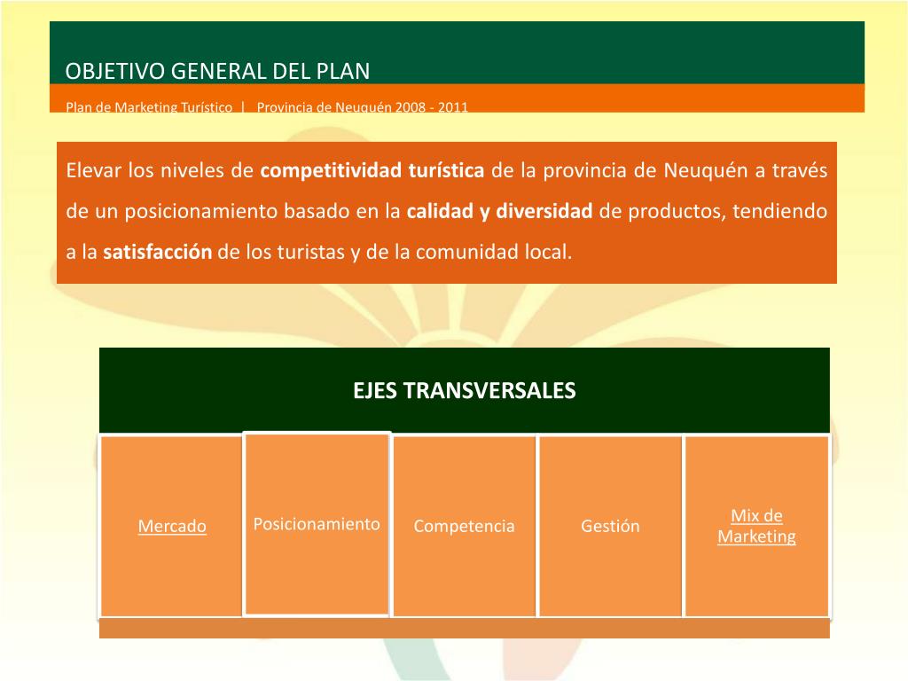 OBJETIVO GENERAL DEL PLAN Plan de Marketing Turístico | Provincia de Neuquén 2008 - 2011 • Elevar los niveles de competitividad turística de la provincia de Neuquén a través de un posicionamiento basado en la calidad y diversidad de productos, tendiendo a la satisfacción de los turistas y de la comunidad local.