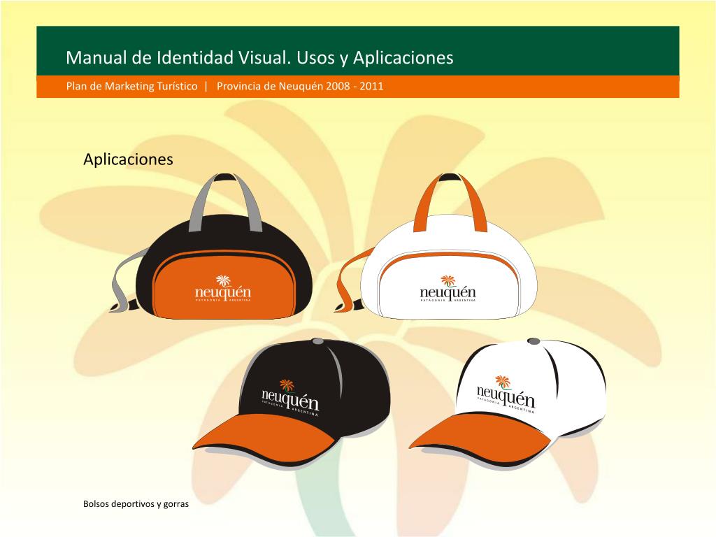 Manual de Identidad Visual. Usos y Aplicaciones Plan de Marketing Turístico | Provincia de Neuquén 2008 - 2011 Aplicaciones Bolsos deportivos y gorras