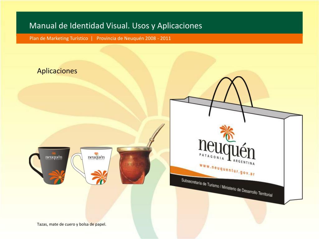 Manual de Identidad Visual. Usos y Aplicaciones Plan de Marketing Turístico | Provincia de Neuquén 2008 - 2011 Aplicaciones Tazas, mate de cuero y bolsa de papel.
