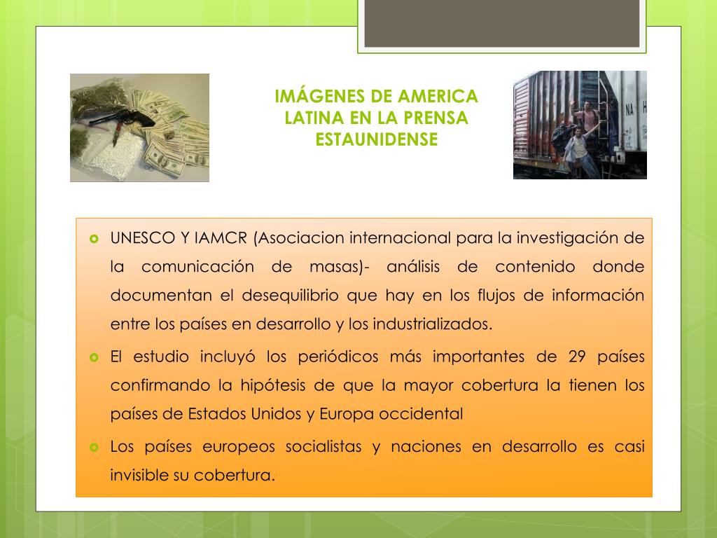 IMÁGENES DE AMERICA LATINA EN LA PRENSA ESTAUNIDENSE UNESCO Y IAMCR (Asociacion internacional para la investigación de la comunicación de masas)- análisis de contenido donde documentan el desequilibrio que hay en los flujos de información entre los países en desarrollo y los industrializados. El estudio incluyó los periódicos más importantes de 29 países confirmando la hipótesis de que la mayor cobertura la tienen los países de Estados Unidos y Europa occidental Los países europeos socialistas y naciones en desarrollo es casi invisible su cobertura.