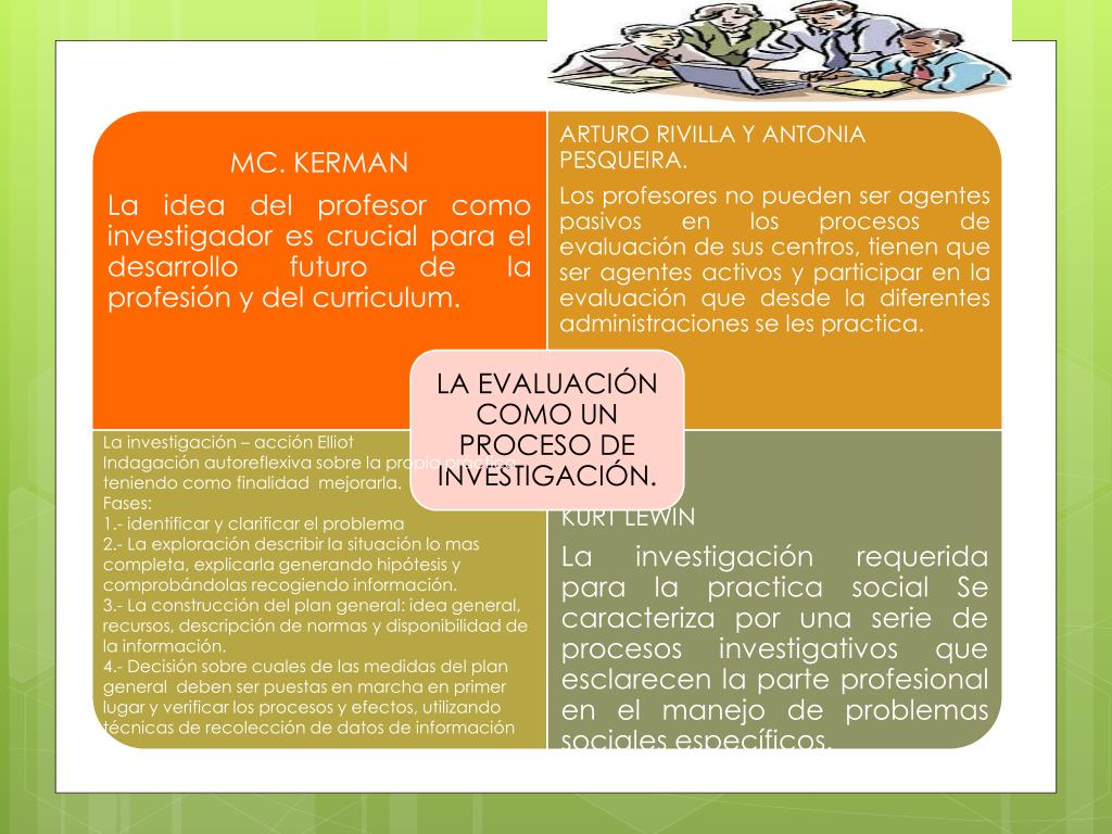 Proceso sistemático de recolección y análisis de información, para describir la realidad y emitir juicios de valor en la toma de decisiones. Momentos que distinguen la implementación de acciones de la evaluación institucional: Planificación, definición de los aspectos que van a ser evaluados y los objetivos que se persiguen, se explican los propósitos, las situaciones, métodos, y el impacto de resultados, se asignan los responsables y los recursos. Implementación recolección de la información y toma de decisiones. Análisis y elaboración de conclusiones se explica el problema identificado, con la evaluación de los datos, la contrastación de hipótesis, definición de líneas y estrategias de acción. En las conclusiones se podría elaborar un pequeño documento con las condiciones mas importante y que este al alcance de todos . elaboración de un informe concreto, entendible y facilite su utilización, incluyendo sugerencias y propuestas para incorporar en el diseño del proyecto. Construir una cultura evaluativa, incorporándola como una práctica cotidiana, para mejorar y potenciar el desarrollo de sus miembros. Es un proceso reflexivo, riguroso de indagación sobre la realidad, que atiende al contexto considerando situaciones explicitas como implícitas regida de validez, participación y ética.