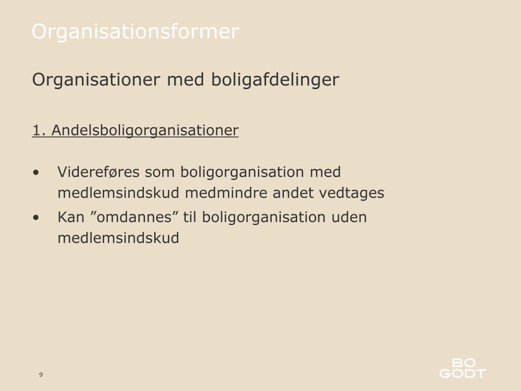 Organisationsformer • Organisationer med boligafdelinger • 1. Andelsboligorganisationer • Videreføres som boligorganisation med medlemsindskud medmindre andet vedtages • Kan ”omdannes” til boligorganisation uden medlemsindskud