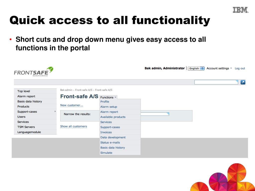 Quick access to all functionality • Short cuts and drop down menu gives easy access to all functions in the portal