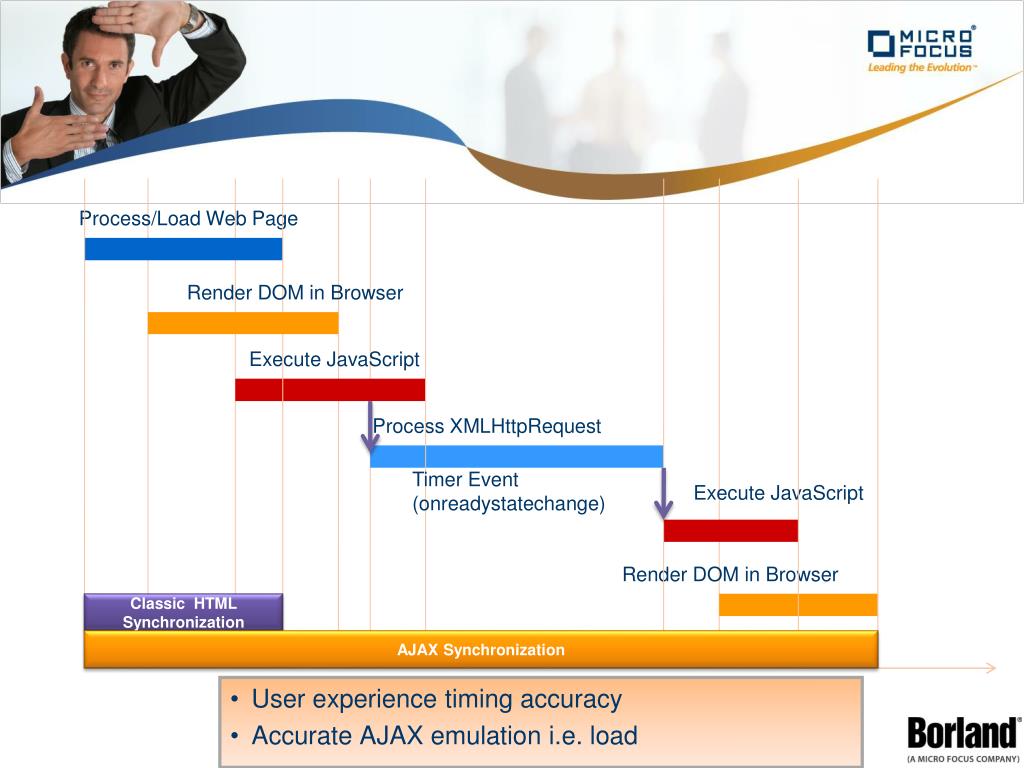 Process/Load Web Page • User experience timing accuracy • Accurate AJAX emulation i.e. load • Render DOM in Browser • Execute JavaScript Process XMLHttpRequest • Timer Event • (onreadystatechange) • Execute JavaScript • Render DOM in Browser Classic HTML Synchronization AJAX Synchronization