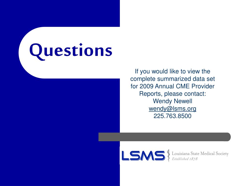 Questions If you would like to view the complete summarized data set for 2009 Annual CME Provider Reports, please contact:Wendy Newell wendy@lsms.org225.763.8500