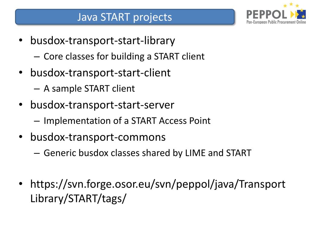 Java START projects • busdox-transport-start-library • Coreclasses for building a START client • busdox-transport-start-client • A sample START client • busdox-transport-start-server • Implementation of a START Access Point • busdox-transport-commons • Genericbusdoxclassesshared by LIME and START • https://svn.forge.osor.eu/svn/peppol/java/TransportLibrary/START/tags/