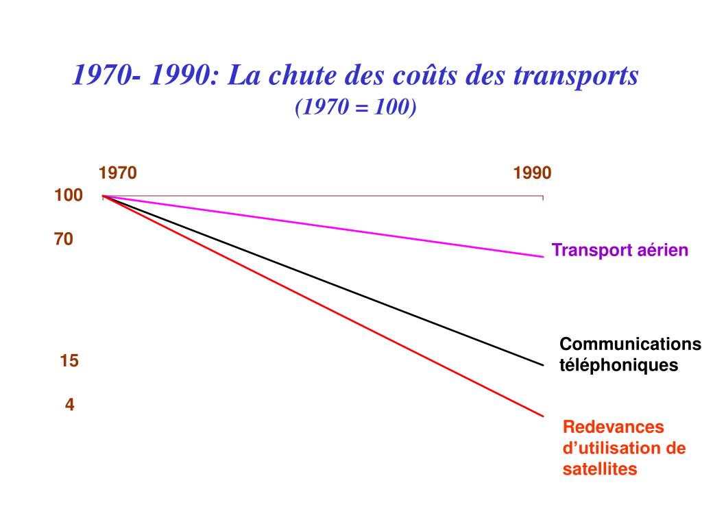 1970- 1990: La chute des coûts des transports (1970 = 100) 1970 1990 100 70 Transport aérien Communications téléphoniques 15 4 Redevances d’utilisation de satellites