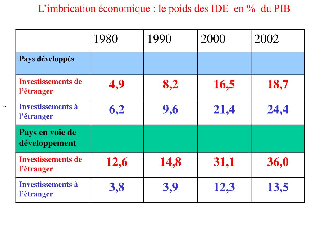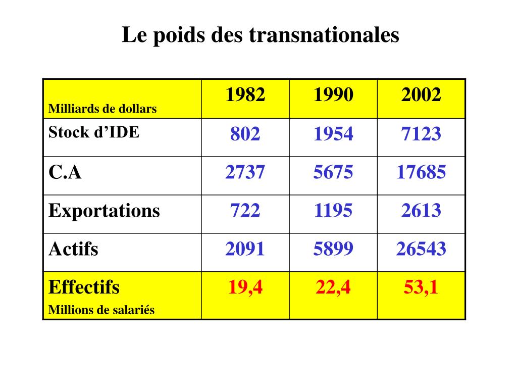 Quelques compléments sur le poids des transnationales L’ensemble du CA des transnationales avait en 2002 CA équivalant à 55% du PIB mondial (contre 25% en 1982) Les dans les exportations mondiales les transnationales représentent 33% des exportations mondiales L’ensemble des ventes de leurs filiales installées à l’étranger représente un montant équivalant à 122% des exportations mondiales Les 350 premières internationales ont un CA équivalent à 28% du PNB mondial Les 100 premières contrôlent 20% des investissement directs à l’étranger .