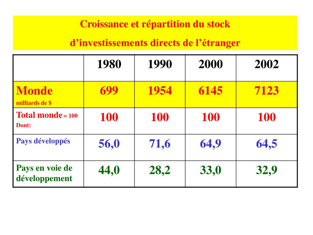 Croissance et répartition du stock d’investissements directs de l’étranger
