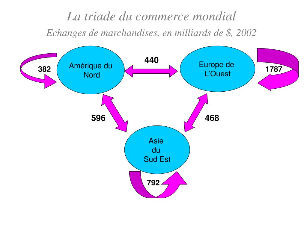 La triade du commerce mondialEchanges de marchandises, en milliards de $, 2002 Amérique du Nord Europe de L’Ouest 440 382 1787 596 468 Asie du Sud Est 792