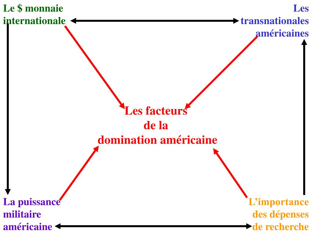 Le $ monnaie internationale Les transnationales américaines Les facteurs de la domination américaine La puissance militaire américaine L’importance des dépenses de recherche