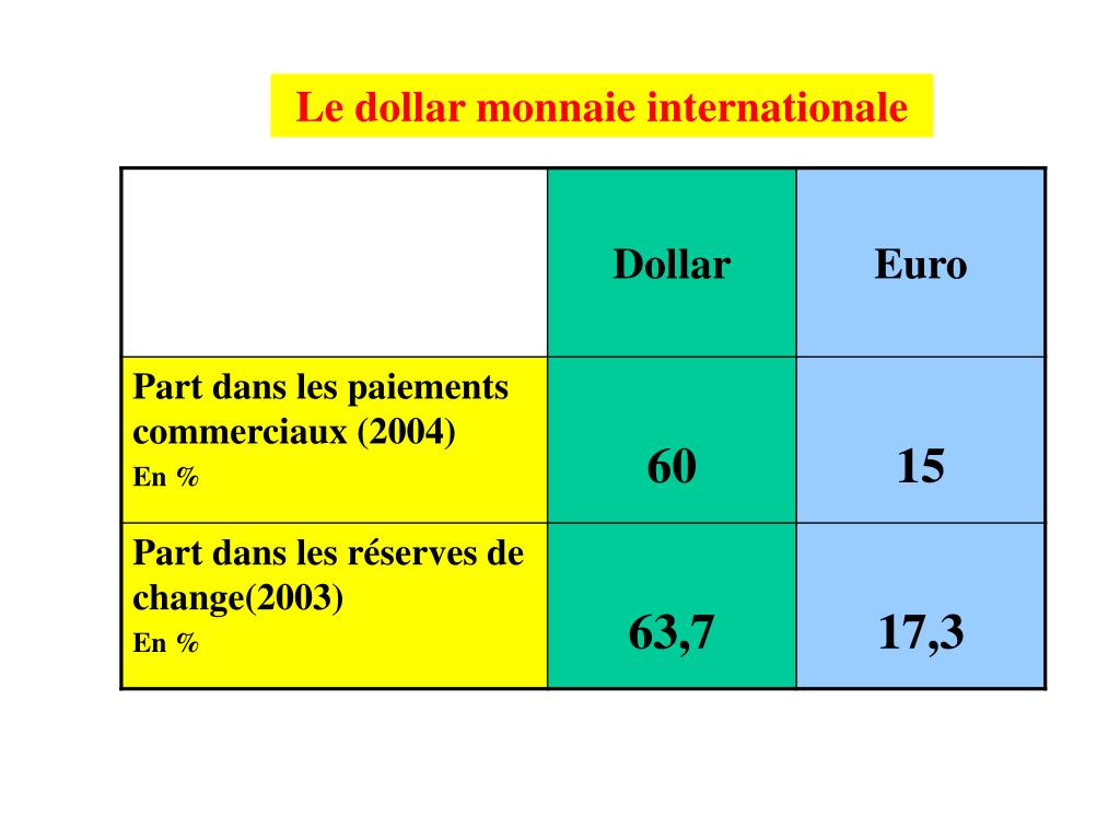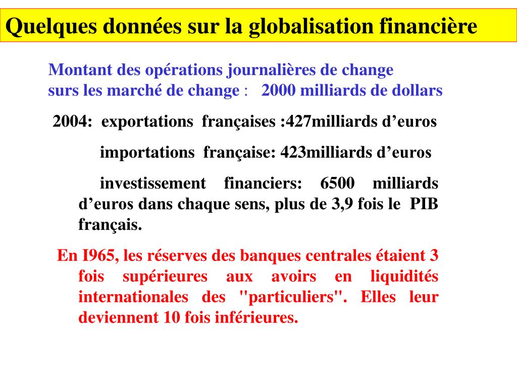 Quelques données sur la globalisation financière Montant des opérations journalières de change surs les marché de change : 2000 milliards de dollars • : exportations françaises :427milliards d’euros • importations française: 423milliards d’euros • investissement financiers: 6500 milliards d’euros dans chaque sens, plus de 3,9 fois le PIB français. • En I965, les réserves des banques centrales étaient 3 fois supérieures aux avoirs en liquidités internationales des "particuliers". Elles leur deviennent 10 fois inférieures.