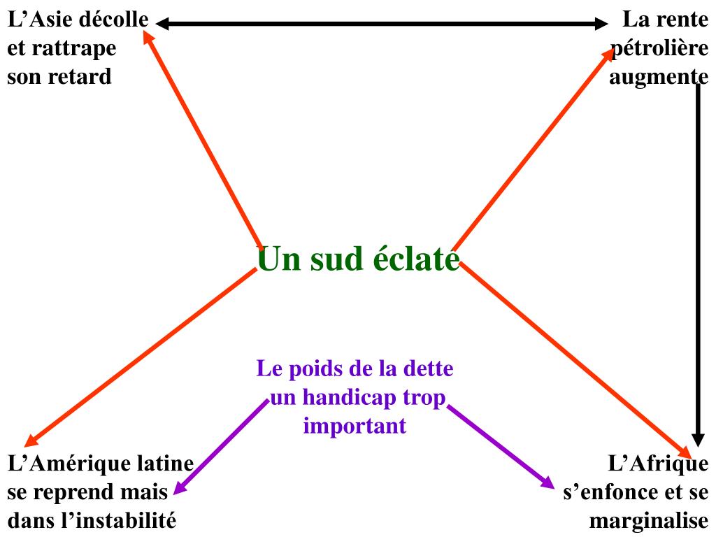 L’Asie décolle et rattrape son retard La rente pétrolière augmente Un sud éclaté Le poids de la dette un handicap trop important L’Amérique latine se reprend mais dans l’instabilité L’Afrique s’enfonce et se marginalise