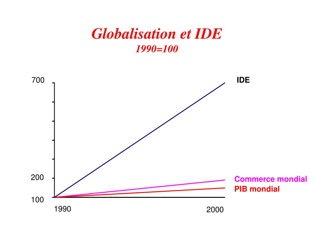 Globalisation et IDE1990=100 700 IDE 200 Commerce mondial PIB mondial 100 1990 2000