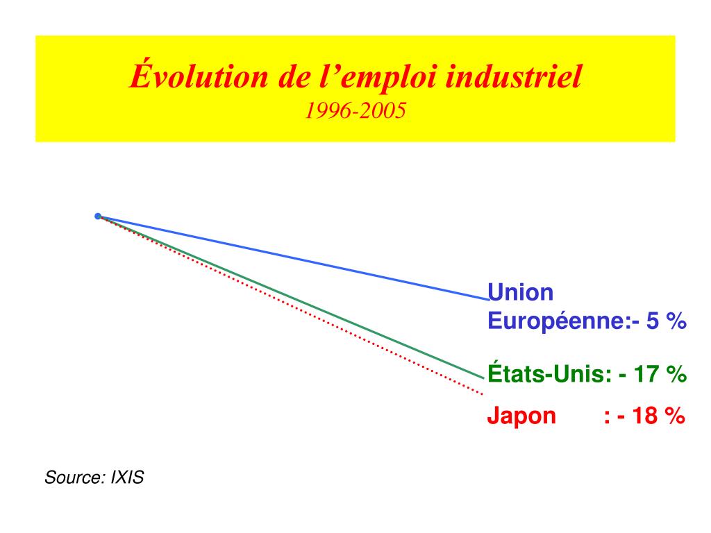 Évolution de l’emploi industriel1996-2005 Union Européenne:- 5 % États-Unis: - 17 % Japon : - 18 % Source: IXIS