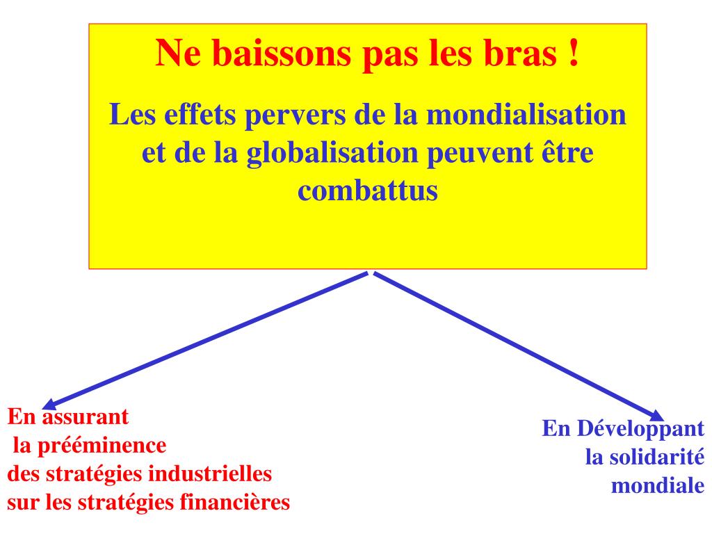 Ne baissons pas les bras ! Les effets pervers de la mondialisation et de la globalisation peuvent être combattus En assurant la prééminence des stratégies industrielles sur les stratégies financières En Développant la solidarité mondiale