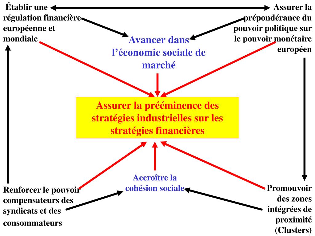 Établir une régulation financière européenne et mondiale Assurer la prépondérance du pouvoir politique sur le pouvoir monétaire européen Avancer dans l’économie sociale de marché Assurer la prééminence des stratégies industrielles sur les stratégies financières Accroître la cohésion sociale Promouvoir des zones intégrées de proximité (Clusters) Renforcer le pouvoir compensateurs des syndicats et des consommateurs