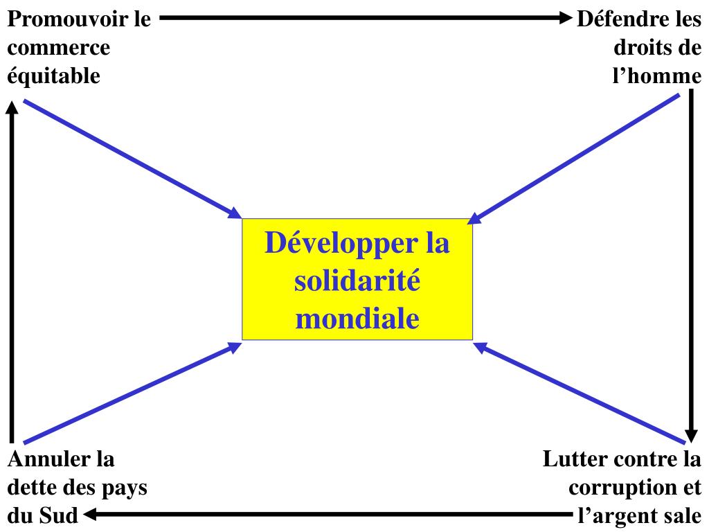 Promouvoir le commerce équitable Défendre les droits de l’homme Développer la solidarité mondiale Annuler la dette des pays du Sud Lutter contre la corruption et l’argent sale