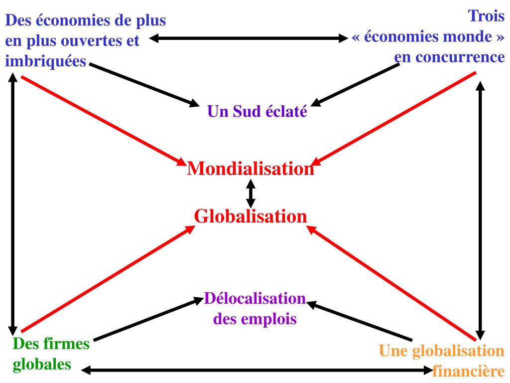 Trois « économies monde » en concurrence Des économies de plus en plus ouvertes et imbriquées Un Sud éclaté Mondialisation Globalisation Délocalisation des emplois Des firmes globales Une globalisation financière