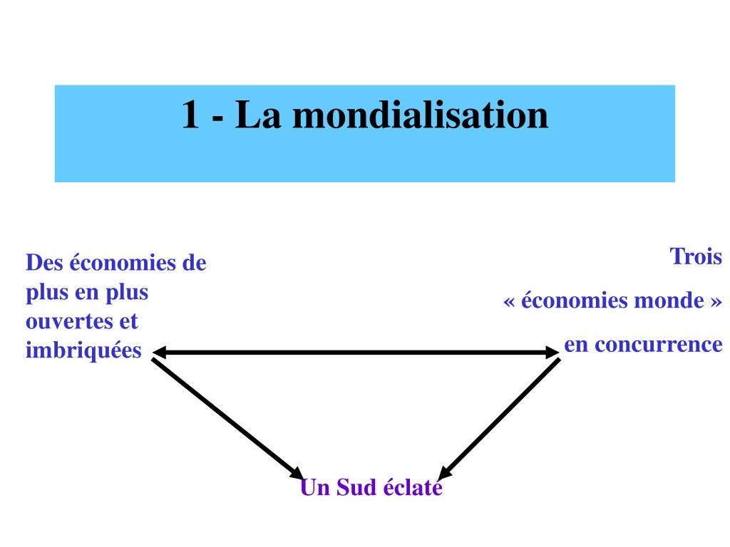 1 - La mondialisation Trois « économies monde » en concurrence Des économies de plus en plus ouvertes et imbriquées Un Sud éclaté