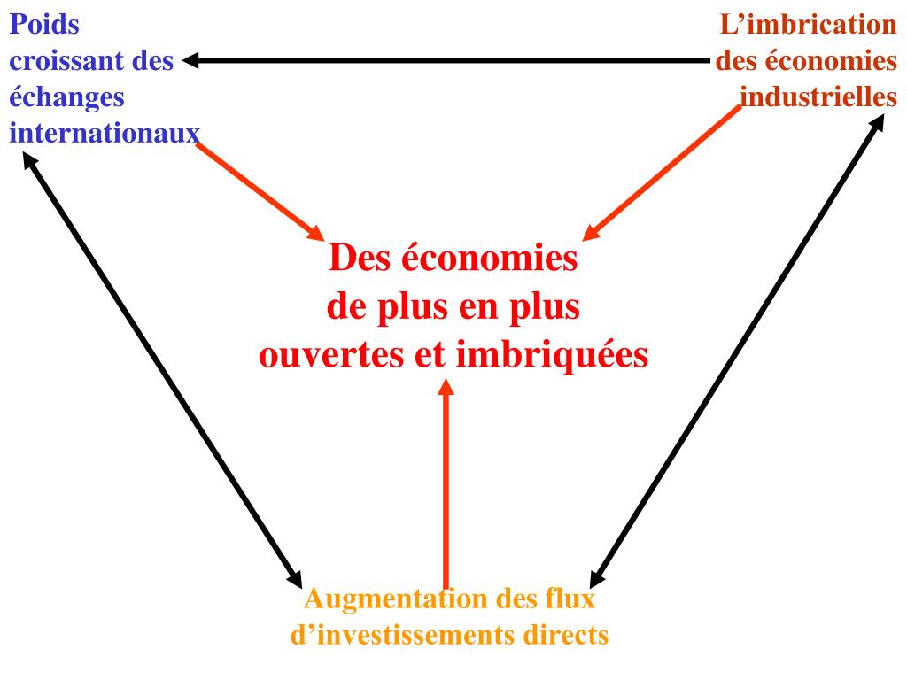 Poids croissant des échanges internationaux L’imbrication des économies industrielles Des économies de plus en plus ouvertes et imbriquées Augmentation des flux d’investissements directs