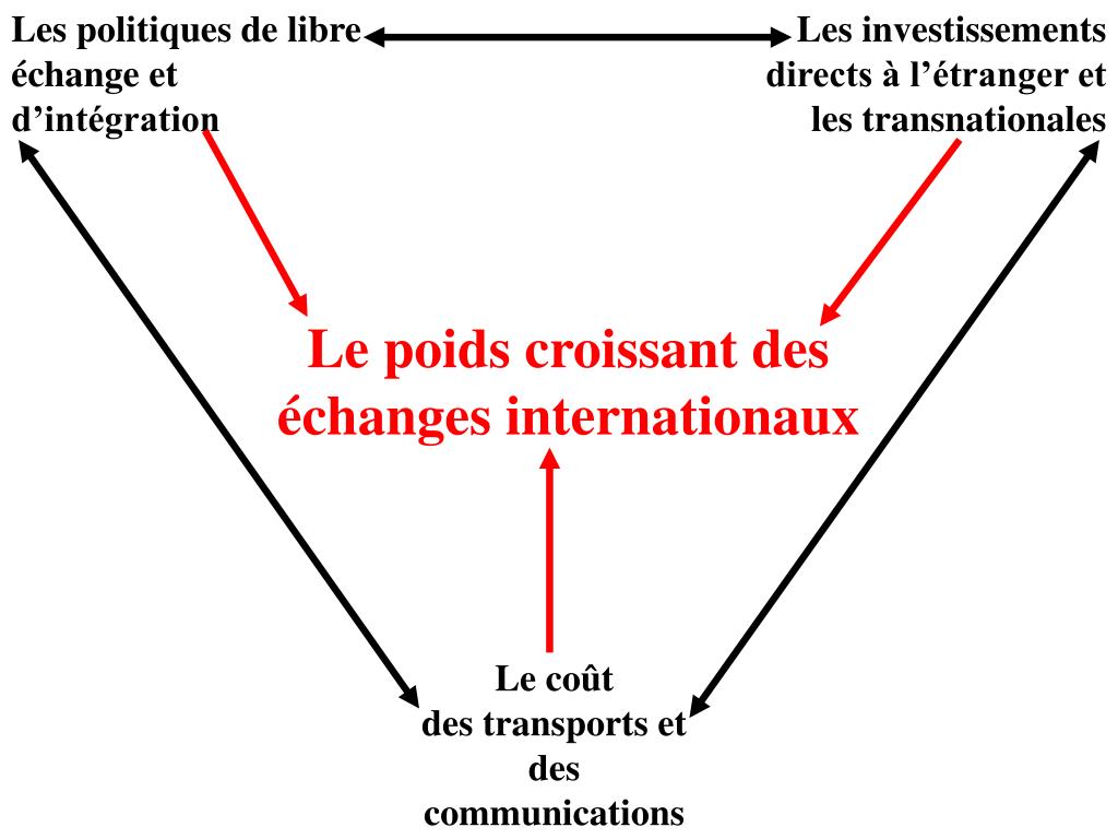 Les politiques de libre échange et d’intégration Les investissements directs à l’étranger et les transnationales Le poids croissant des échanges internationaux Le coût des transports et des communications