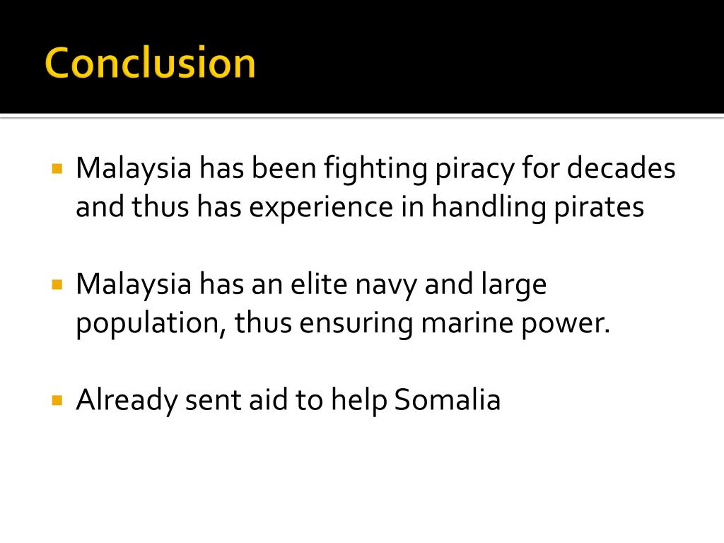 Conclusion • Malaysia has been fighting piracy for decades and thus has experience in handling pirates • Malaysia has an elite navy and large population, thus ensuring marine power. • Already sent aid to help Somalia